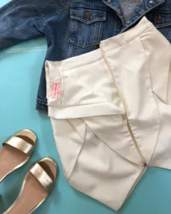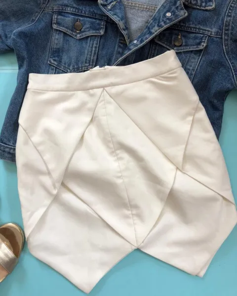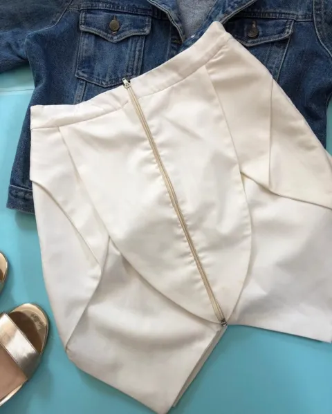 Falda color blanco hueso con puntas picudas en la parte de abajo, cierre completo. Ideal para usarlo este verano