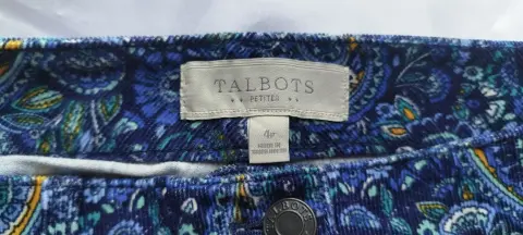 Falda de pana y estampado paisley azul de Talbots, corte en A, con cinturilla fija de 1,5", dos bolsillos delanteros (cosidos) y cierre de cremallera en la parte delantera. Sin forroTalla 4p (CH)Medidas tomadas por un solo lado:*Cintura 37 cm*Largo 42 cm