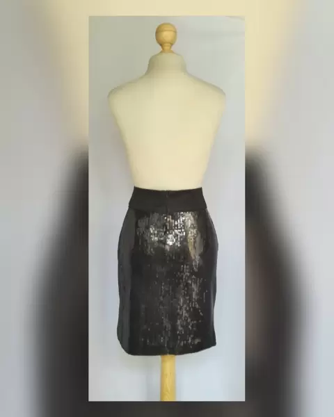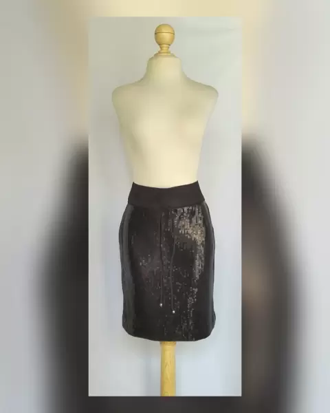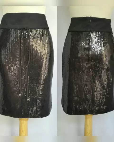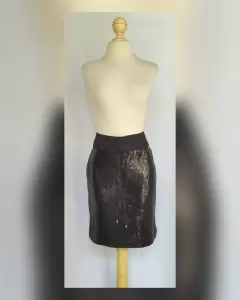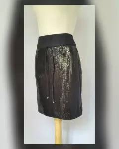 Falda corta estilo recto c/lentejuela cosida tono NEGRO ÉBANO, pretina alta c/jaretas, cierre p/cremallera trasera y forro interior. Talla 30. Dimensiones cms: 39 cintura, 46 cadera, 46 zona baja, 54 largo. 95% poliéster, 5% elastano. Para lavado en casa.***POR LA COMPOSICIÓN DE LA PRENDA ES SEMI STRETCH PERO SIN SUBIR A LA SIG TALLA***