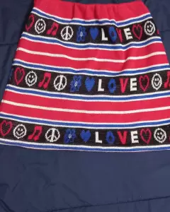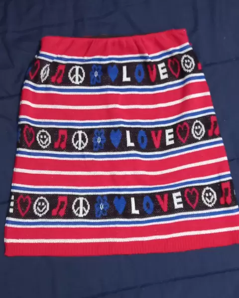 Linda falda de rayas rojo,blanco y azul.Letras L O V EEs corta , trae resorte en la cintura.