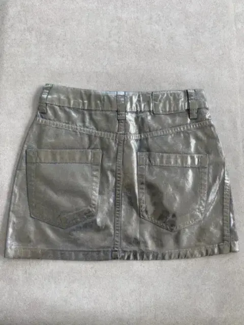 Falda corta plateada en tela brillosa tipo metalizada. Tiene cierre, botón y bolsillos. Súper linda! Nueva a estrenar con etiqueta!