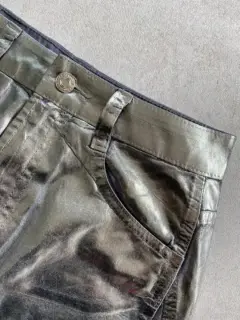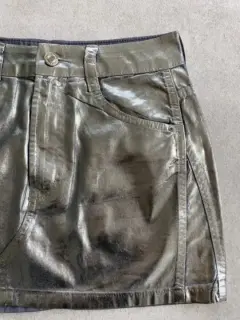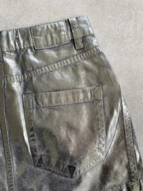 Falda corta plateada tela brillosa metalica. Falda corta plateada en tela brillosa tipo metalizada. Tiene cierre, botón y bolsillos. Súper linda! Nueva a estrenar con etiqueta!