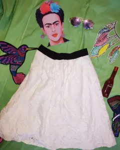 Falda en corte A, color crema y en cintura negro, tiene cierre por atrás, talla extra chica, la tela tiene un hermoso grabado con flores como lo muestro en foto y tiene fondo para que no se transparente.Envío todos los días de lunes a sábado.