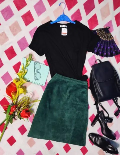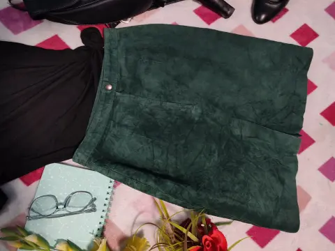 Falda de antelina T-5. •Te interesa? Escucho ofertas•Deseas varias prendas? armo tu paquete✨ Falda de antelina verde bandera, corta, queda dos dedos arriba de la rodilla. Broche de presión y cierre para abrochar en la parte de atrás, pequeña abertura en la parte de abajo (atrás). Cuenta con forro en la parte de abajo. Talla 5, posible 7.