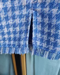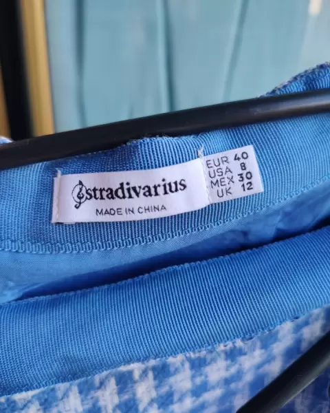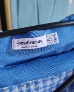 Falda color azul claro con rayas azules. Tiene de un ligero corte en la pierta haciendo que luzca mas linda, tiene forro por dentro. Y cierre en la parte de atras
