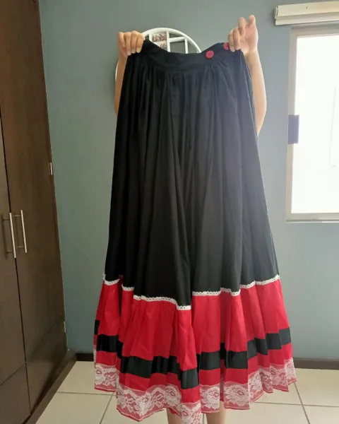 Falda de folklore. Esta falda es ideal para practicar danza de folkloreDe la cintura mide maxino 66 y 60 con boton pero si necesits hacerlo mas pequeño si se puedeSe abrocha a la cinturaDe altur mide 1 metro con 68 cm