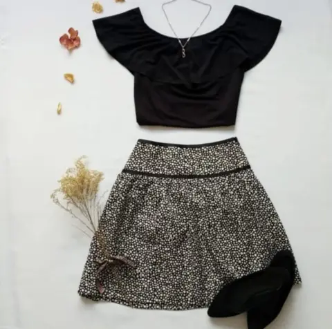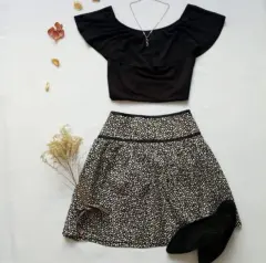 Bonita falda negra con lunares blancos, cierre atrás y con detalle en pretina, es un poco plisada 1/3 de cadera es lisa y después viene lo plisado