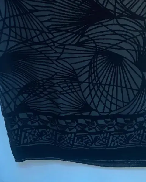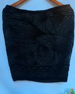 Falda de maya estampado geométrico. Falda de maya estampado geométrico, la líneas negras de terciopelo negro y en la parte de la cintura, forro incluído en el interior de la falda. Cierre en el costado de la falda.Talla:M (30-32)Marca: MAX EDITION