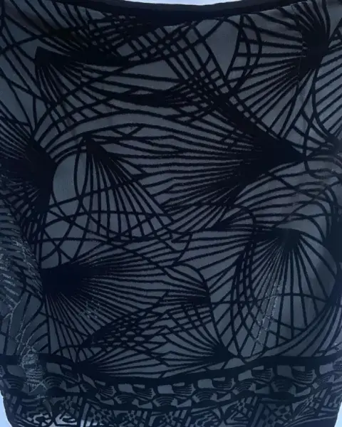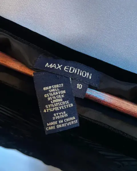 Falda de maya estampado geométrico, la líneas negras de terciopelo negro y en la parte de la cintura, forro incluído en el interior de la falda. Cierre en el costado de la falda.Talla:M (30-32)Marca: MAX EDITION