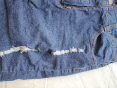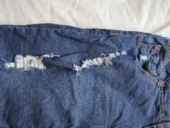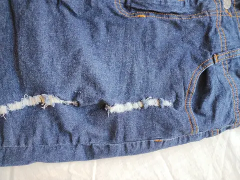 Falda de mezclilla para niña. Acabados de mezclilla rota. No tiene detalles.