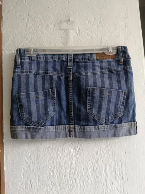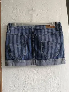 Falda de mezclilla. Queda mejor a talla 27.La tela es gruesa y estira poco No tiene detalles