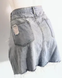 Falda de mezclilla de bolsillos expuesto. Super bonita Falda de mezclilla, con diseño de bolsillos expuestos y deshilachado, cierre y botón al frente y bolsillos en la parte trasera, talla XLCintura 50 cm,Cadera 64 cm yLargo 45 cm.