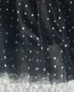 Falda unitalla de tul negra con diseño de estrellas plata, tienen fondo no transparente. Es larga tipo midi. Y resorte en la cintura. Etiqueta pero marca no reconocida.