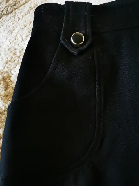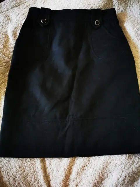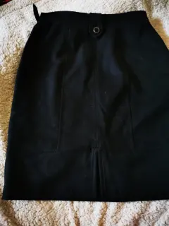 Falda de vestir a la cintura, de Lana, color negro, corte recto con abertura en la parte de atrás, prensillas para cinturón dos bolsillos laterales frontales con forro talla MMedidas de la cintura 40 cm medida de largo 60 cm