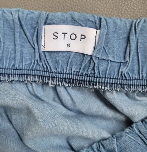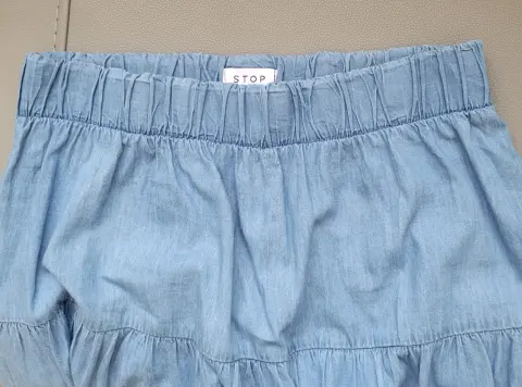 Falda denim. Falda en tela tipo denim, 100% algodón, largo midi, con elastico en cintura, largo total 97 cm, talla L