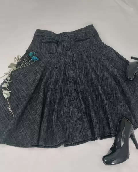 Esta hermosa! Y luce bellisima. Mezclilla delgada. Color negro grisáceo. Los botones de enfrente son de adorno y tiene dos bolsitas al frente. Con cierre al costado y la tela tiene buen strech. Talla M/L61% algodón.Cintura: 39 cmLargo: 66 cm