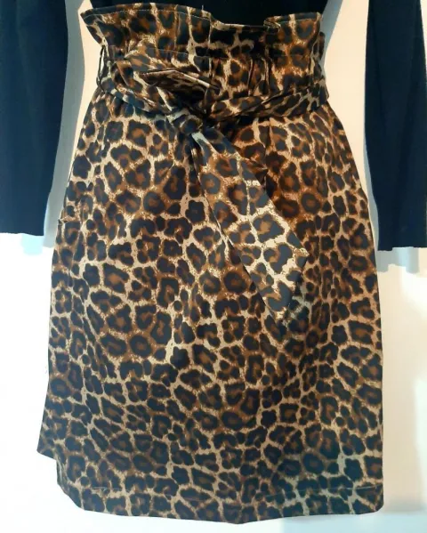 Falda de tubo, estampado de animal print leopardo, con 2 bolsas en ambos lados laterales, con pretina ancha de resorte y un liston que se puede anudar. Se amolda muy bien al cuerpo. Queda a una talla M