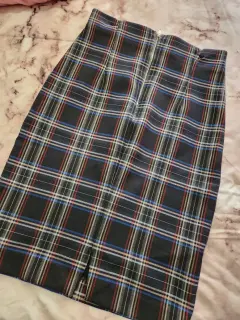 Falda lapiz zara, color gris, rojo, azul marino y negro estampado cuadrado.Talla S.Tela con elastico y cierre trasero y abertura trasera.