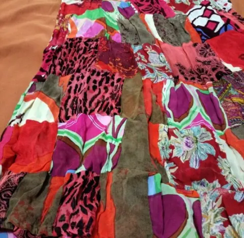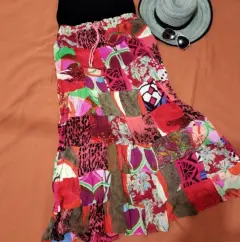 Falda larga boho de parches. Falda poliéster con forro 100% algodón Hecho en INDIA, talla unitalla la cintura se ajusta un poco con cordoncitos.La tela es muy delgada, tiene un dellalles imperceptible que pongo en la última foto