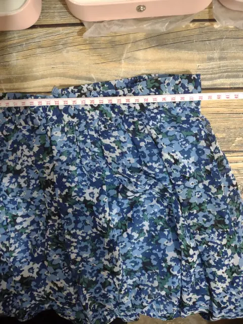 Coqueta falda asimétrica de flore, azul. En perfecto estado, talla L.La parte de adelante es corta y atrás es larga.Con forro, broche y cierre en la parte de atrás, con pliegues en la cintura.Tela delgada y forro.Cintura: 38 cmLargo adelante: 54cmLargo atrás: 83cm