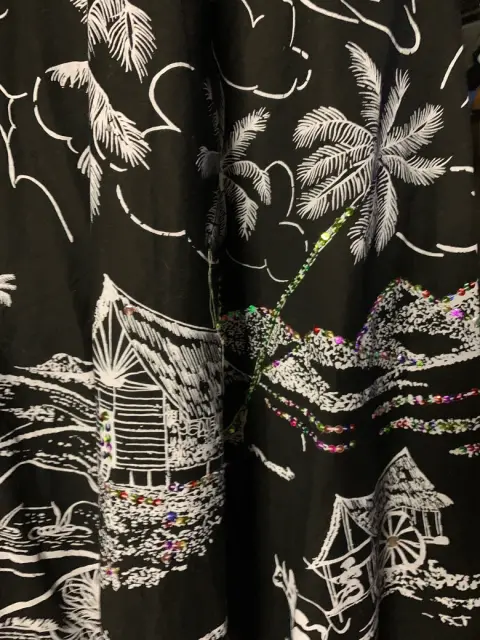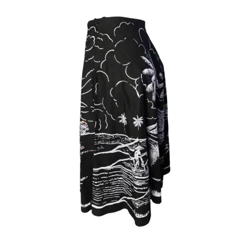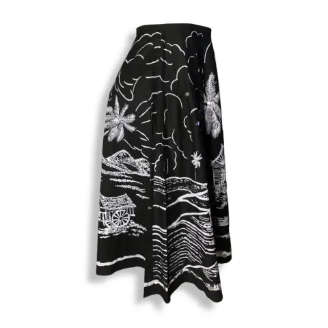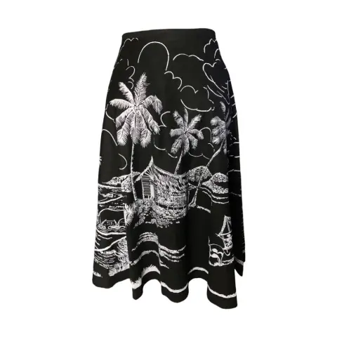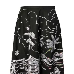 Falda larga negra estampada. Falda midi de tiro alto de color negro vaporosa con poco vuelo, diseño con motivo playero además de pequeñas lenejuelas.100% algodón