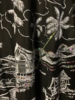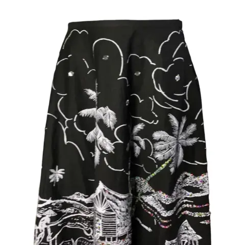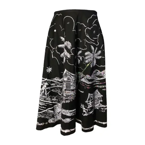 Falda midi de tiro alto de color negro vaporosa con poco vuelo, diseño con motivo playero además de pequeñas lenejuelas.100% algodón