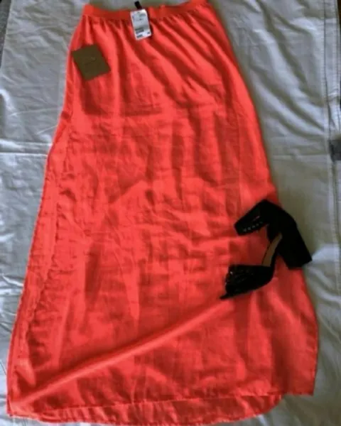 Hermosisima falda larga rosa neon, nueva con etiqueta, tiene fondo y transparencia y apertura en ambos lados de las piernas. Queda talla M y G.