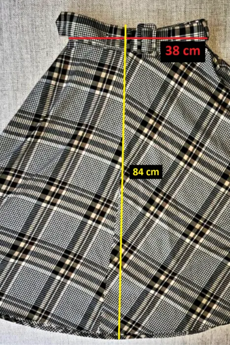 Medidas planas: Cintura 38 cm / Largo 84 cmComposición: 67% poliester / 32% viscosa/ 1% elastanoElasticidad nulaIncluye cinturón