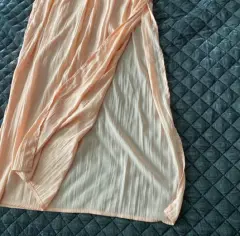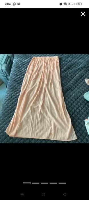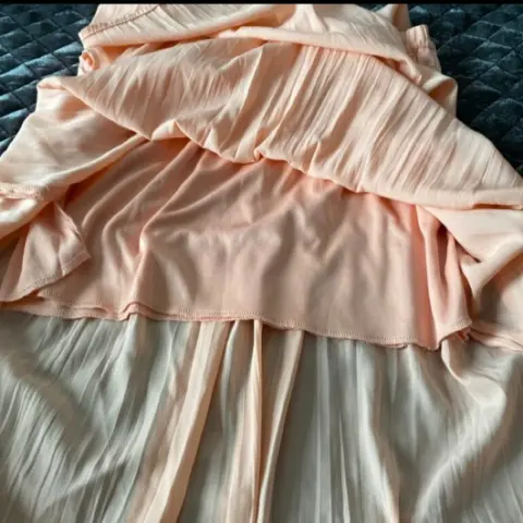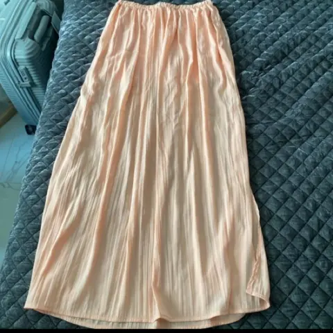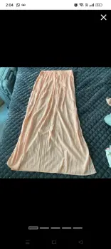 Hermosa falda larga color rosa coral, la tela es como de seda, cuenta con un fondo tipo mini falda. Solo tiene una mancha pequeña hasta abajo.
