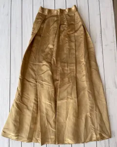 Falda larga satinada dorada. Falda plisada larga, satinada, dorada, a la cintura.Medidas: 33.5 cm de cintura, no tiene resorte más se podrían recorrer los botones un par de centímetros. Largo: 106 cm aproximadamente. No tiene bolsillos laterales. Cierra con dos botones y tiene cierre. Tiene marcas de eso estéticas, nada funcional.
