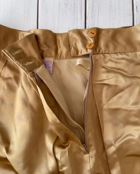 Falda plisada larga, satinada, dorada, a la cintura.Medidas: 33.5 cm de cintura, no tiene resorte más se podrían recorrer los botones un par de centímetros. Largo: 106 cm aproximadamente. No tiene bolsillos laterales. Cierra con dos botones y tiene cierre. Tiene marcas de eso estéticas, nada funcional.