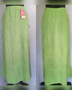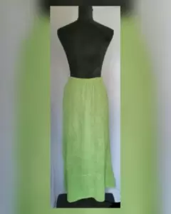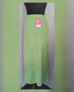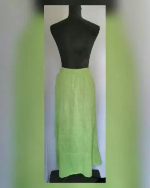 Falda larga en de tejido de punto c/estructura color VERDE IRLANDÉS, c/elástico en cintura p/mejor ajuste, corte evasé y forro interior completo. UNITALLA. (da a M/L). Dimensiones: 34 cms cintura, 59.5 cms cadera, 79 cms ruedo, 85 cms largo. 50% acrílico, 50% algodón, forro: 100% algodón. Para lavado en casa.