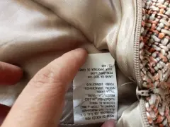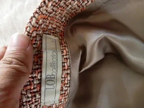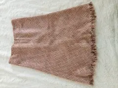 Falda Lob, de tela importada de Corea, tipo tweed, colores naranja, beige y café con flequillo en la parte baja, forrado de acetato. Talla 1 (S).