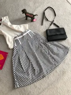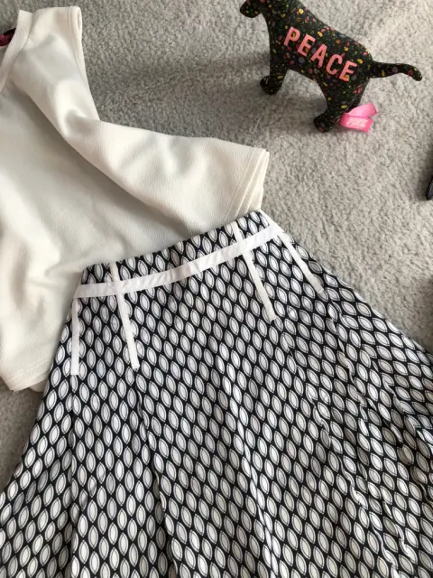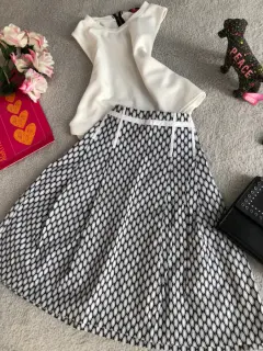 Hermosaaa falda tipo midi, bicolor blanco y azul, con rayas blancas en cintura y cadera para estilizar tu figura, Medidas: cintura 37 cm. Largo 58 cm cadera 46 cm. Talla dice 2R, queda bien a S. Luce divina!!