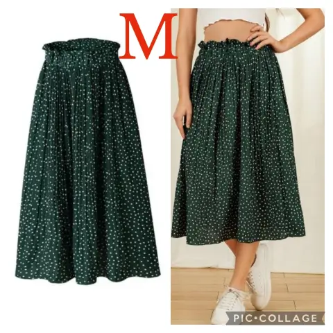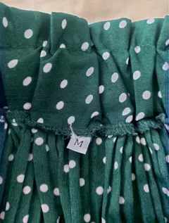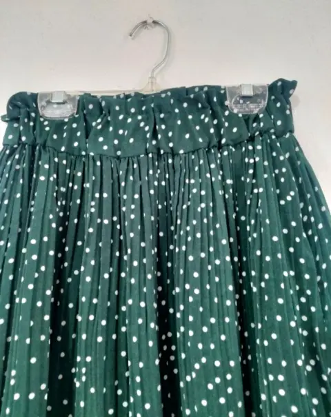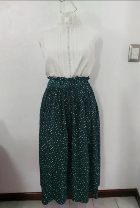 Moderna Falda Plisada con estampado de lunares.Nueva sin etiquetas, solo tiene la de la talla.Talla MCintura alta con resorte que cubre tu estómago.Mismo modelo que la imagen 1Sin detalles y en perfectas condiciones.Tela 35% algodón y 65% poliéster.Tiene bolsas a los laterales.Cintura sin estirar el elástico son 34 cm pero estira hasta 47 cm..... es resorte grueso.Largo: 85 cmEstilo bohemio.