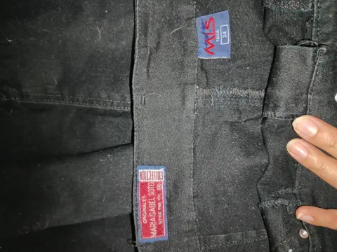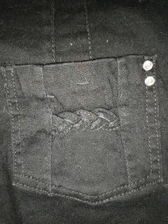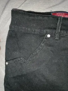 Falda negra de algodón color negro, con una pequeña abertura en la parte trasera, detalles de brillos en los bolsillos delanteros y traseros, muy amplia de la cintura, espandex