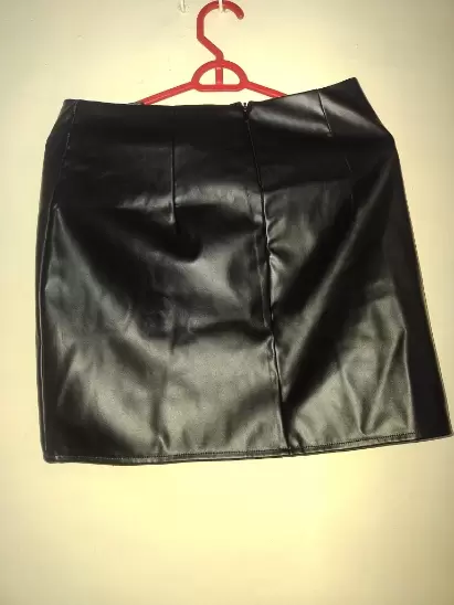 Falda negra tipo vinipiel. Falda cuero PU con abertura, con cierre trasero, largo 40.5 cm, contorno cintura 72 cm, contorno caderas 94