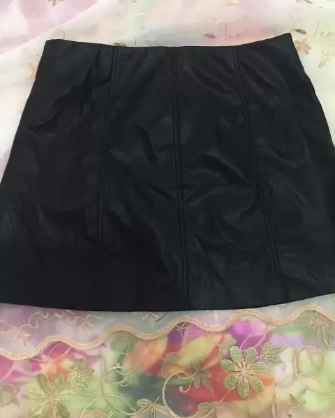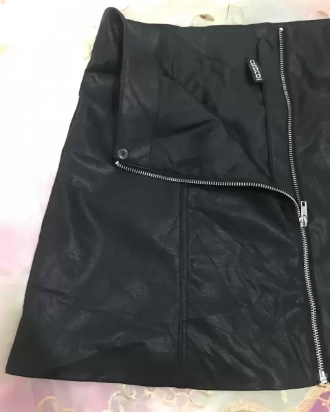 Falda tipo piel, cierre delantero, marcado como 42/10/L, 40cm cintura, 52cm cadera, 41cm largo.