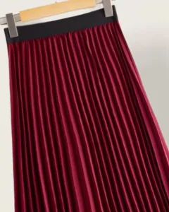 Bellísima falda plisada en color vino con elástico negro en la parte de arriba, el complemento perfecto para tu outfit.