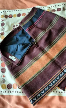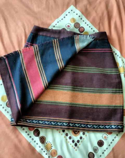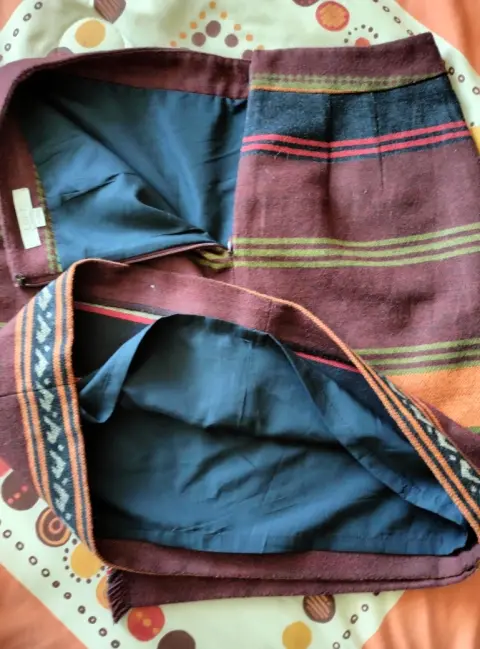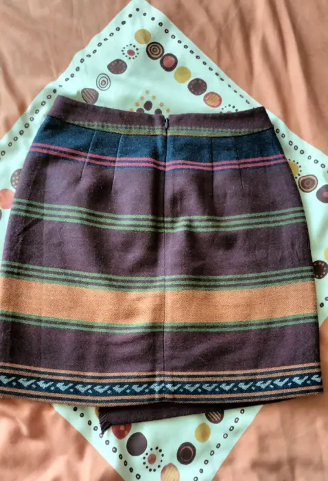 Preciosa falda rayada de colores, tela de lana, forro de poliéster, cierre en la parte trasera.A pesar de ser corta es calientita, la tela frontal simula ser envolvente pero no se abre, ya q va cosida del costado como se puede ver en las fotos. Su corte es ligeramente en "A"L:45C:35Termina en ancho de 47Esta en perfecto estado, su cierre funciona bien