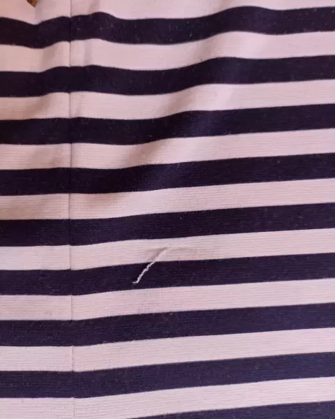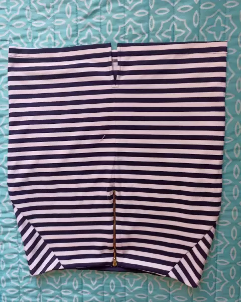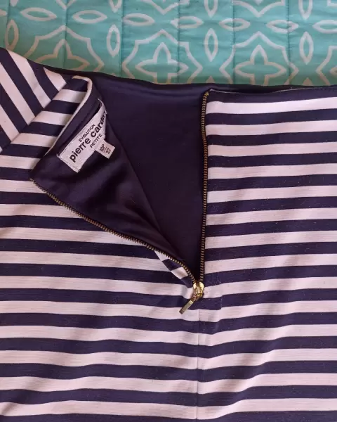 Falda de rayas blancas y azules, con cierre trasero, ligero hilo jalado en la parte de atrás del foto