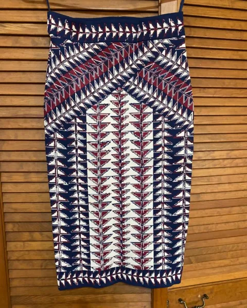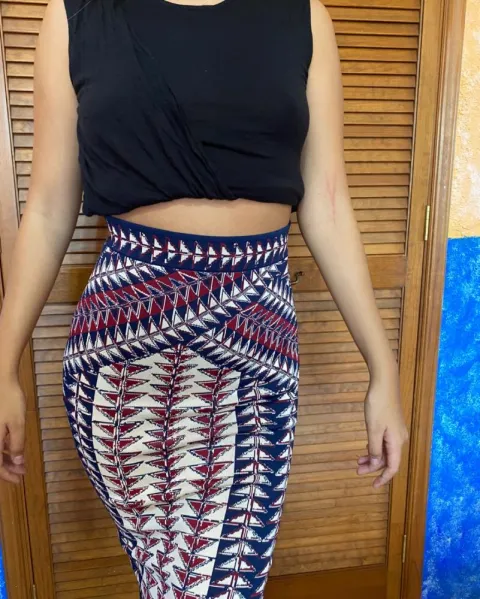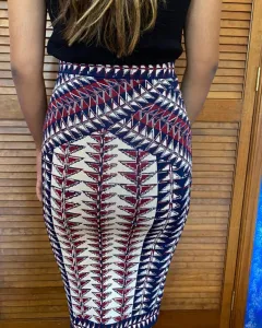 Falda recta. Predomina el color vino , pero también tiene azul y blanco. La tela es elástica ligeramente, es muy cómoda , casual y elegante .
