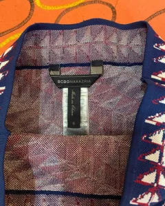 Predomina el color vino , pero también tiene azul y blanco. La tela es elástica ligeramente, es muy cómoda , casual y elegante .