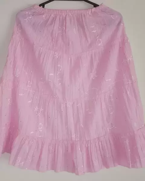 Falda rosa. Falda corte en AColor: Rosa con detalles de lentejuela salpicados y bordados en rosa por lo que de lejos se aprecian poco, anexo foto mas cercaTalla: UnitallaMedidas: *Cintura , es resorte y se ajusta de 25 cm a max 45 cm.*Largo de 62 cm.No trae bolsasEs tela delgadaTrae un manchón pero no se nota mucho y manchitas beige del pegamento de la lentejuela caida, ultima fotoCupón: JanMoPBn0H