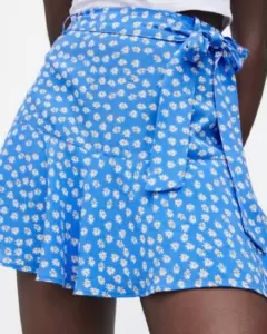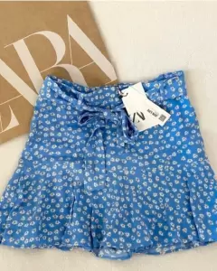 Hermoso short falda, tono azul con flores blancas, cinturón de la misma tela solo es de adorno ya que en un costado tiene cierre, la talla es S pero biene reducido, sus medidas son 34cm de cintura y 40 cm largo, la tela no estira por lo que son medidas máximas.