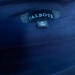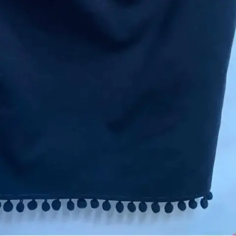 Falda tergal azul marino y perlas de pompón del mismo color. Doble pinza en delantero y espalda, cierre invisible en un costado. Falda corte lápiz y vista en cintura de la falda. Talla: M (30-32) Marca: TALBOTS.