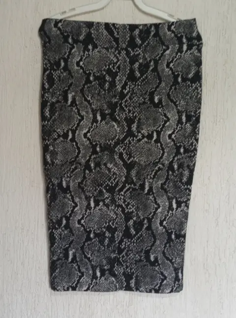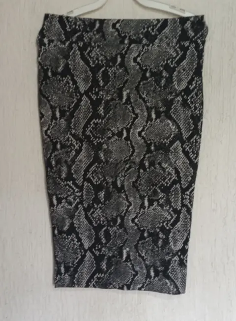 Falda tipo lápiz. Animal print negro con blanco, tipo expandex, abertura por la parte de atrás, 35 cm de cintura, 66 cm de largo.