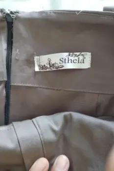 Falda casual tipo lapiz con detalle de argollas ala cintura, en la parte inferior izquierda ya se le cayeron algunas. Medidas: cintura 39 cm, largo 51 cm.