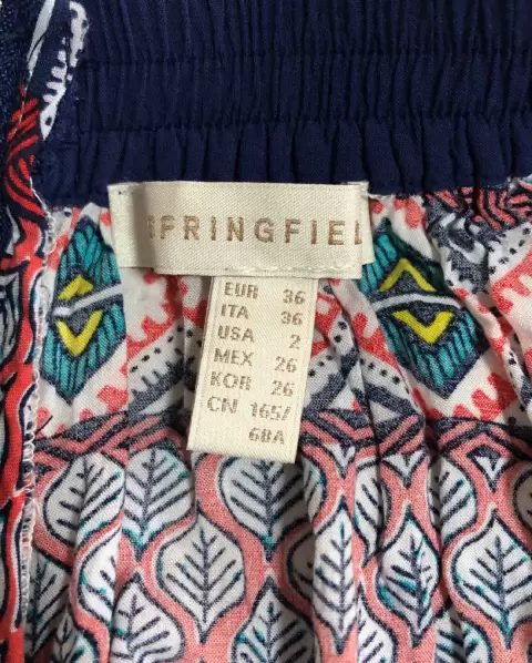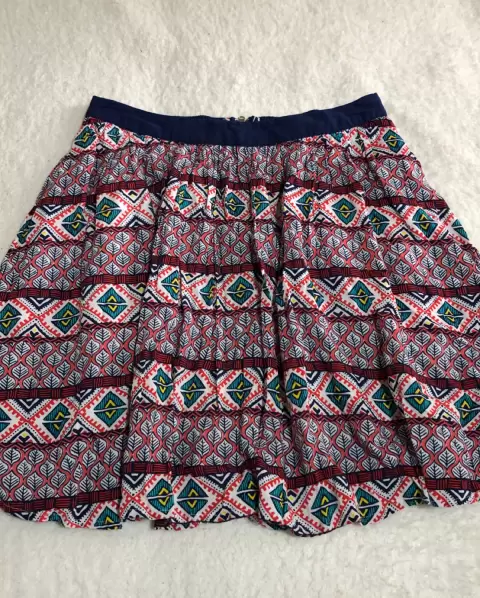 Falda tribal Springfield. Falda circular corta, estilo tribal, con elástico en cintura y cierre. Talla 26, medidas aprox: cintura 66cm, largo 39cm, 100% viscosa, con bolsillos