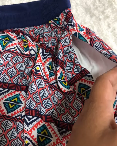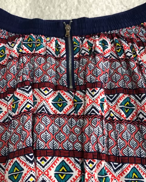 Falda circular corta, estilo tribal, con elástico en cintura y cierre. Talla 26, medidas aprox: cintura 66cm, largo 39cm, 100% viscosa, con bolsillos
